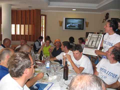 | Mattino dopo. Di nuovo partenza. Ciclisti superstiti molto concentrati sulla posa fotografica. |